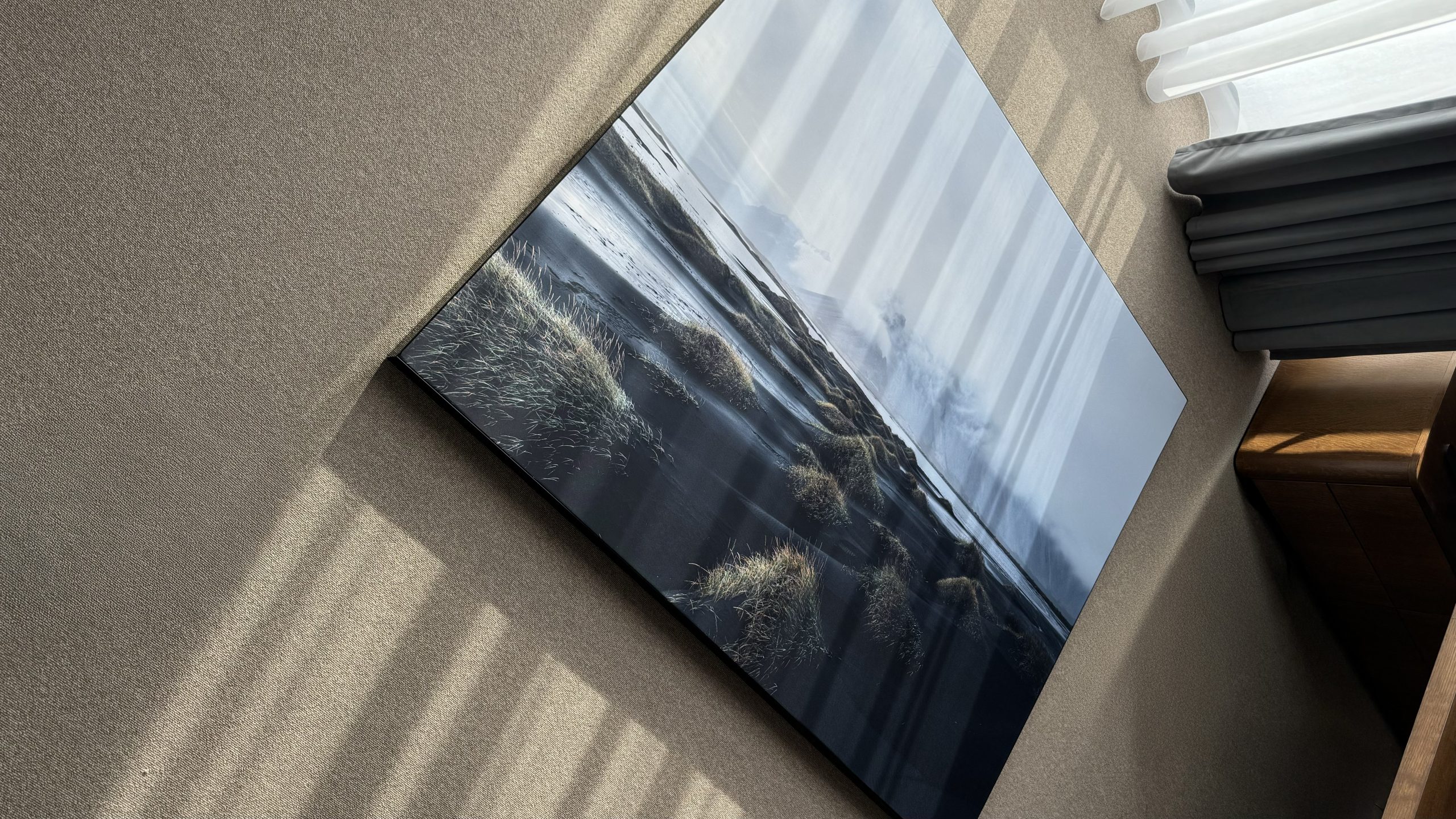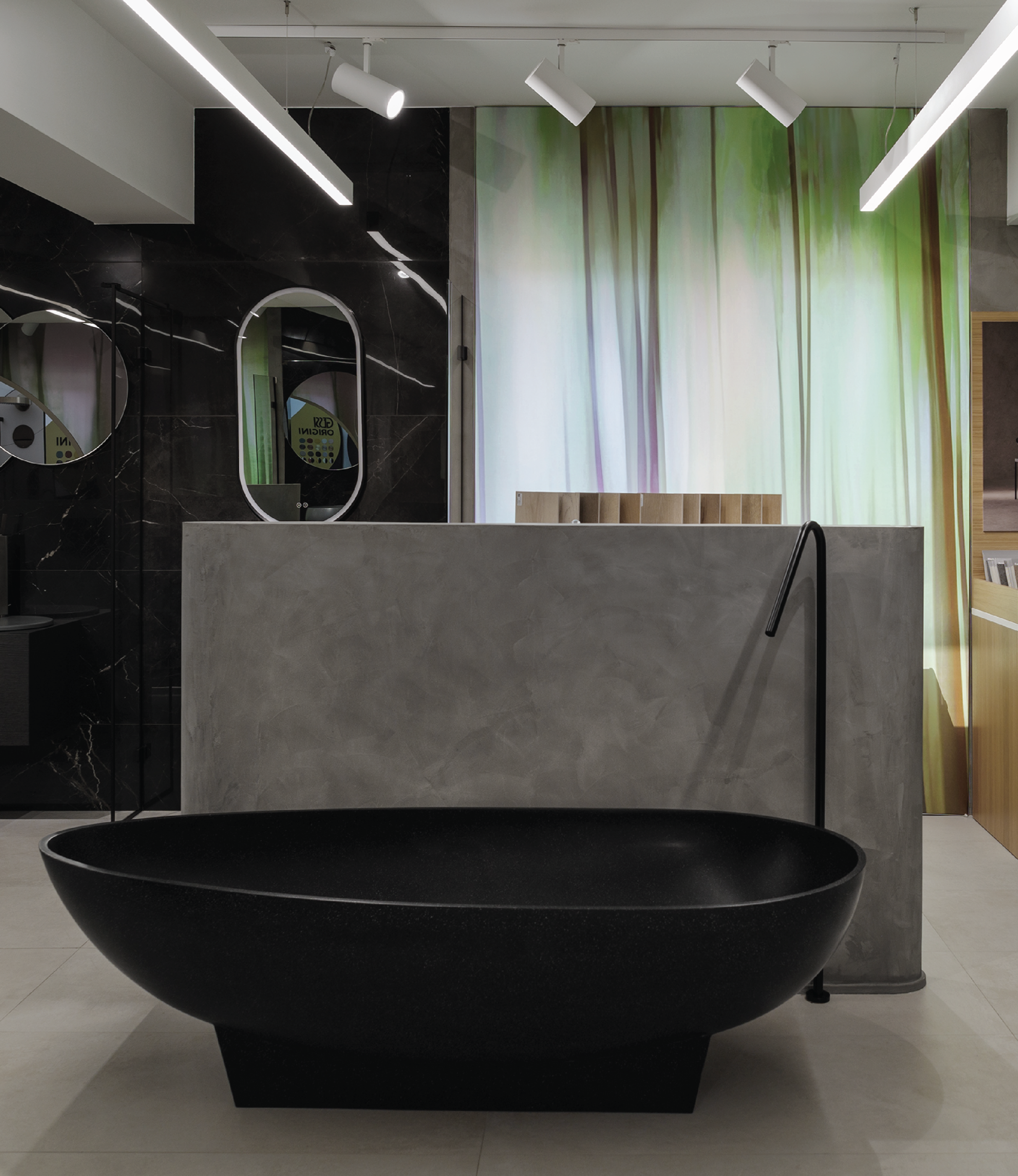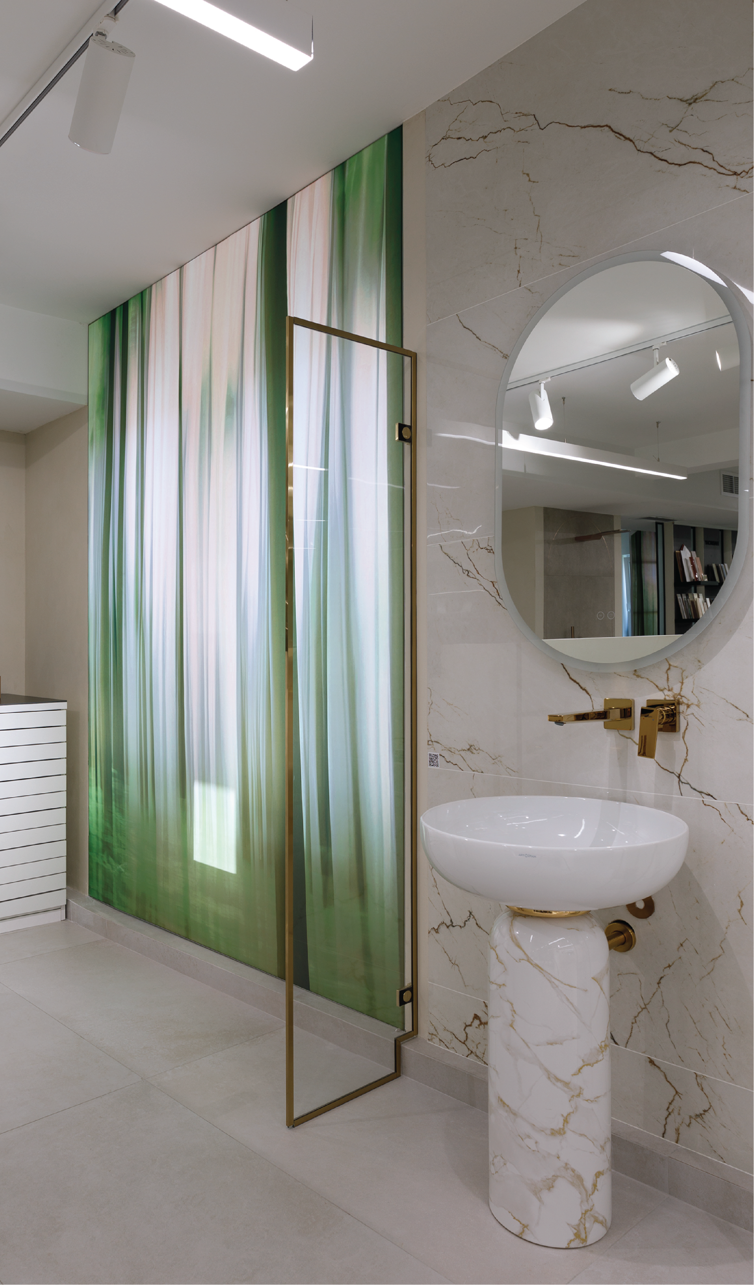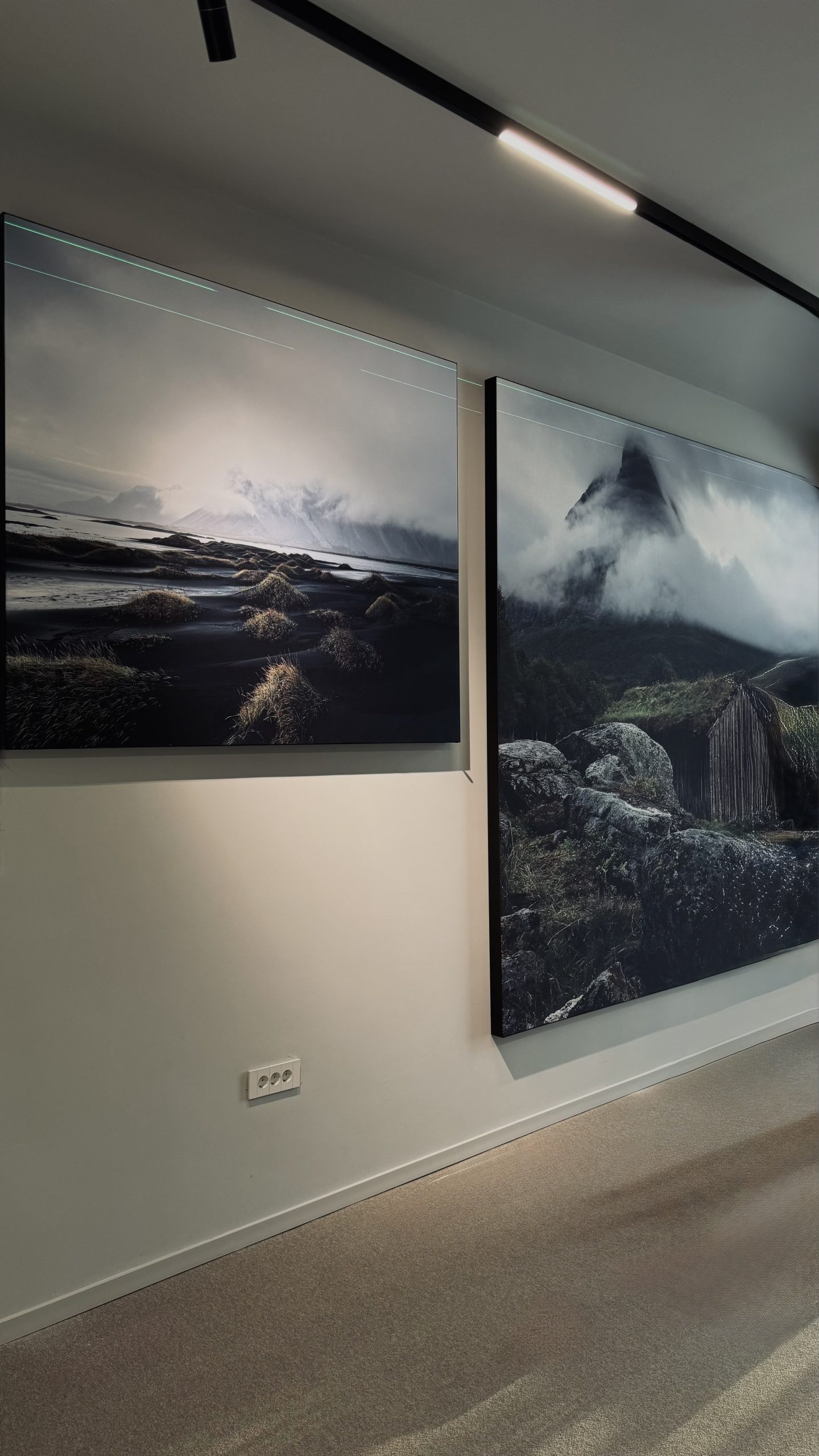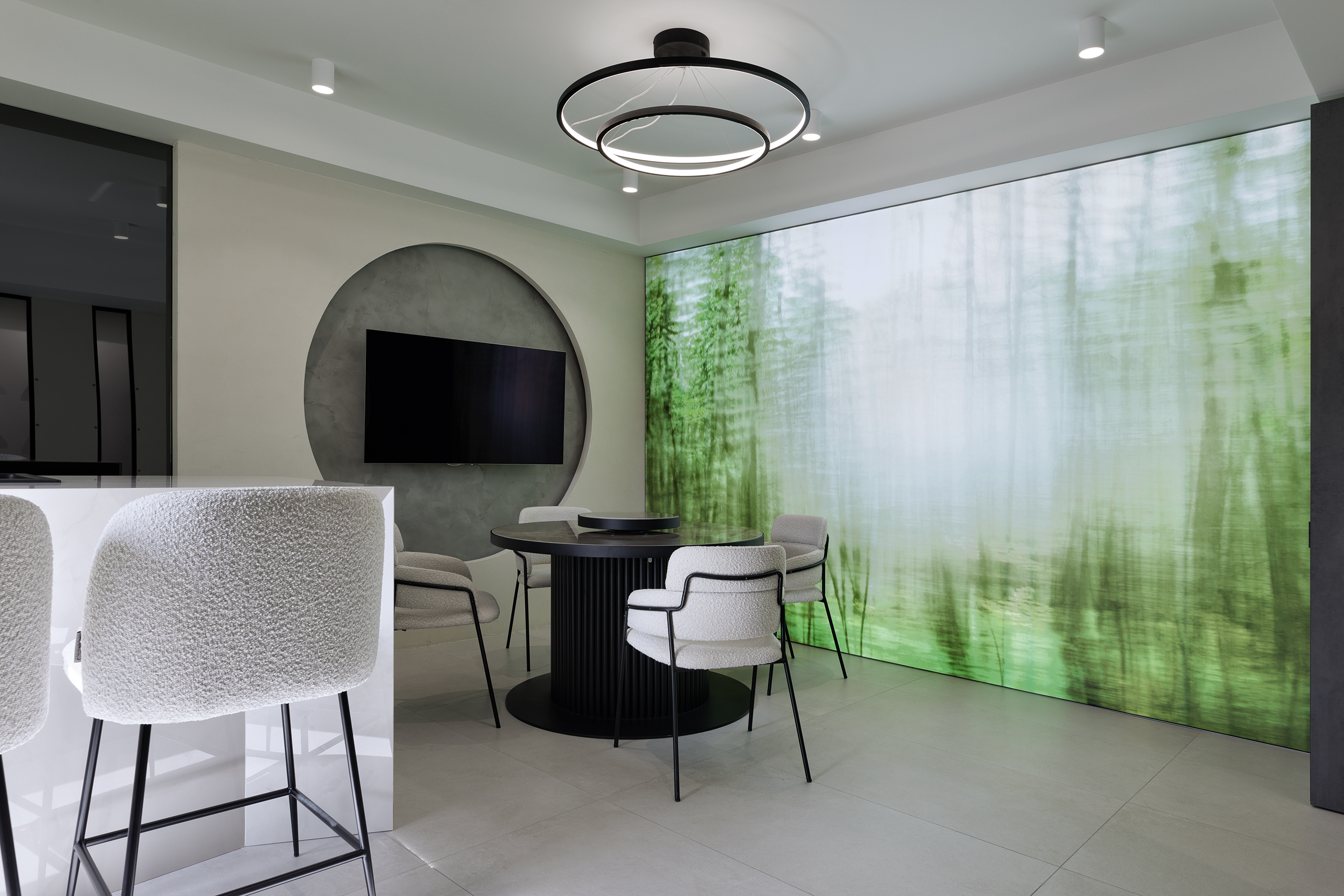In this space, luminous textile lightboxes were introduced to bring visual rhythm and added dynamism to the overall composition. Beyond their aesthetic role, they also served a practical purpose — discreetly masking windows that disrupted the architectural coherence of the space. Instead of being removed, some of these openings were integrated: textiles were applied over certain windows to gently filter natural light.