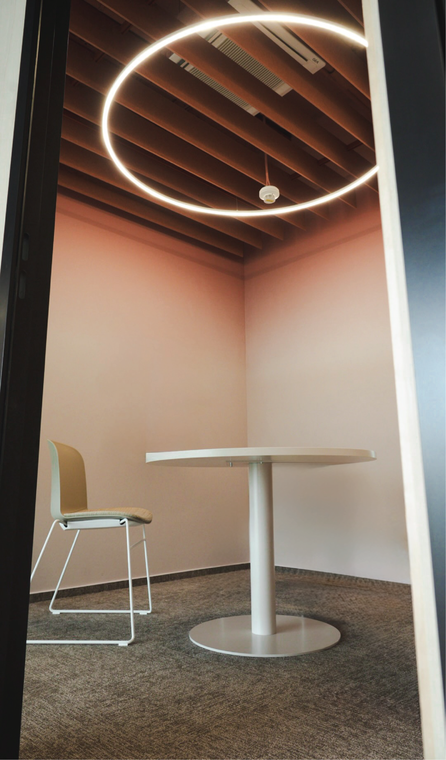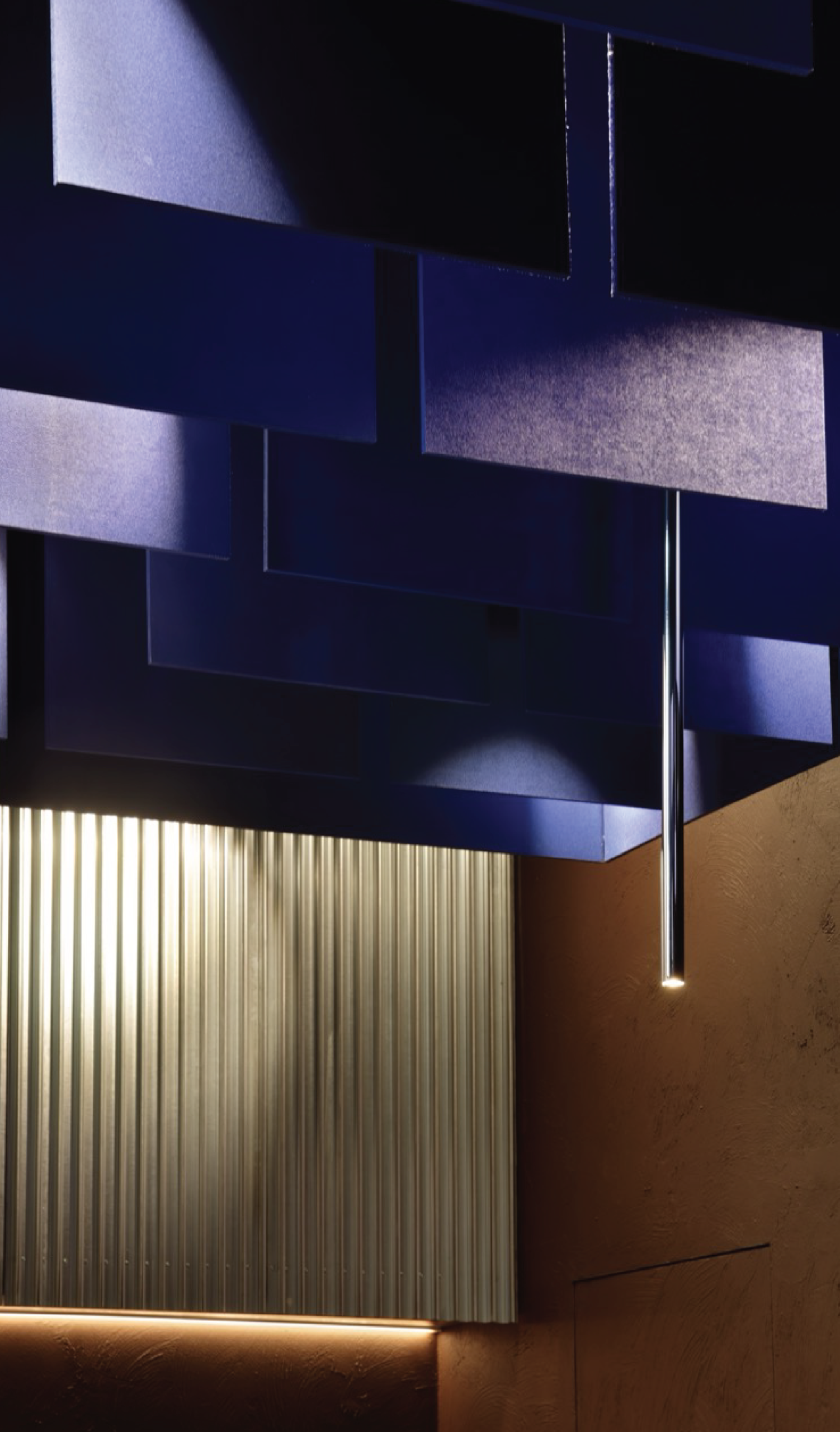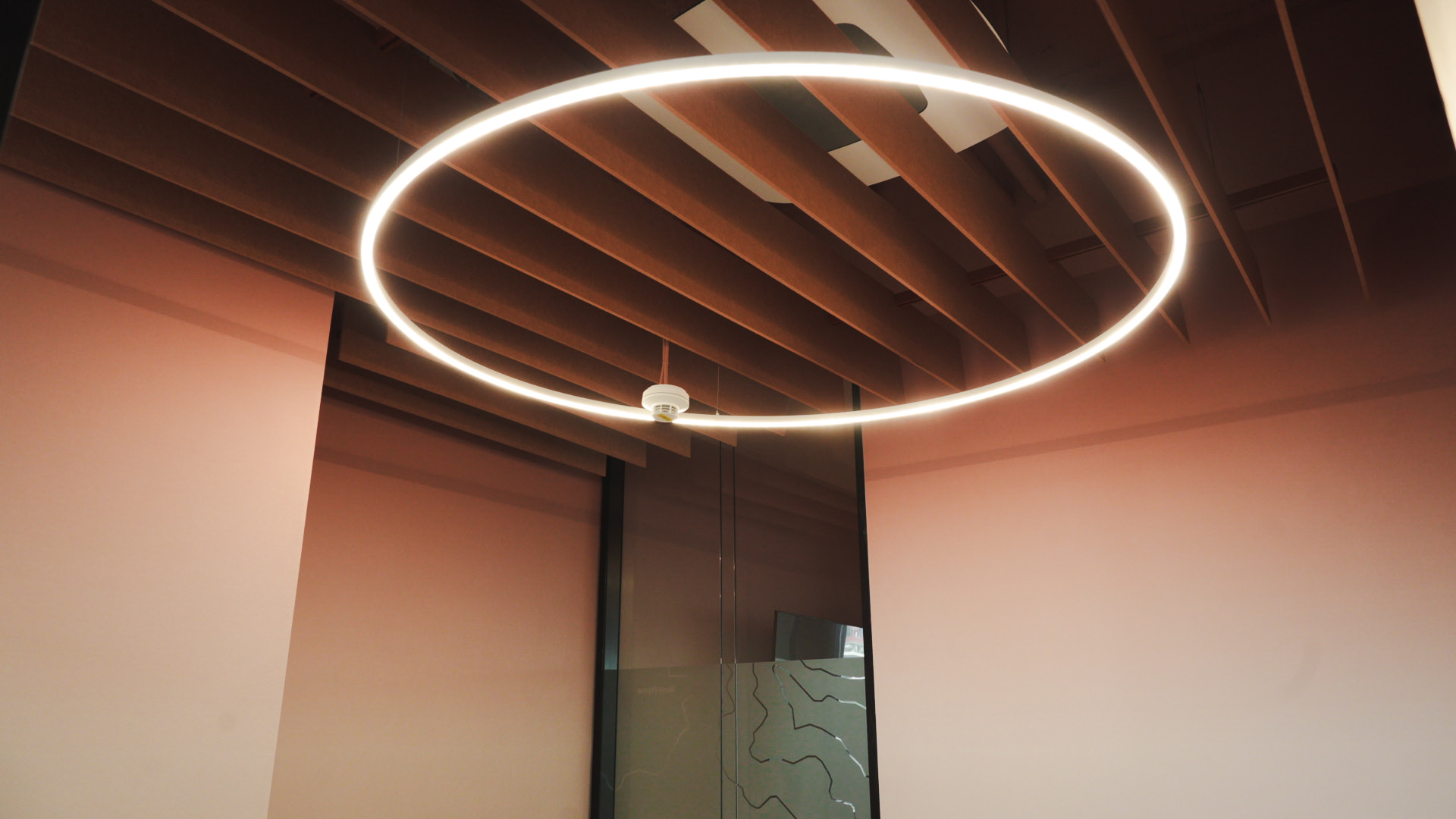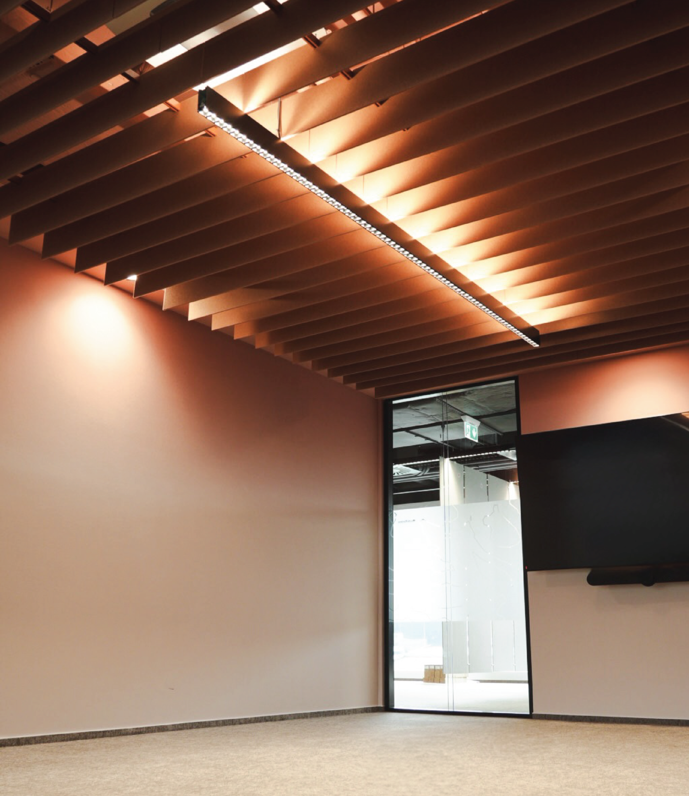 Backlit textile panels that soften the space and diffuse natural warmth.