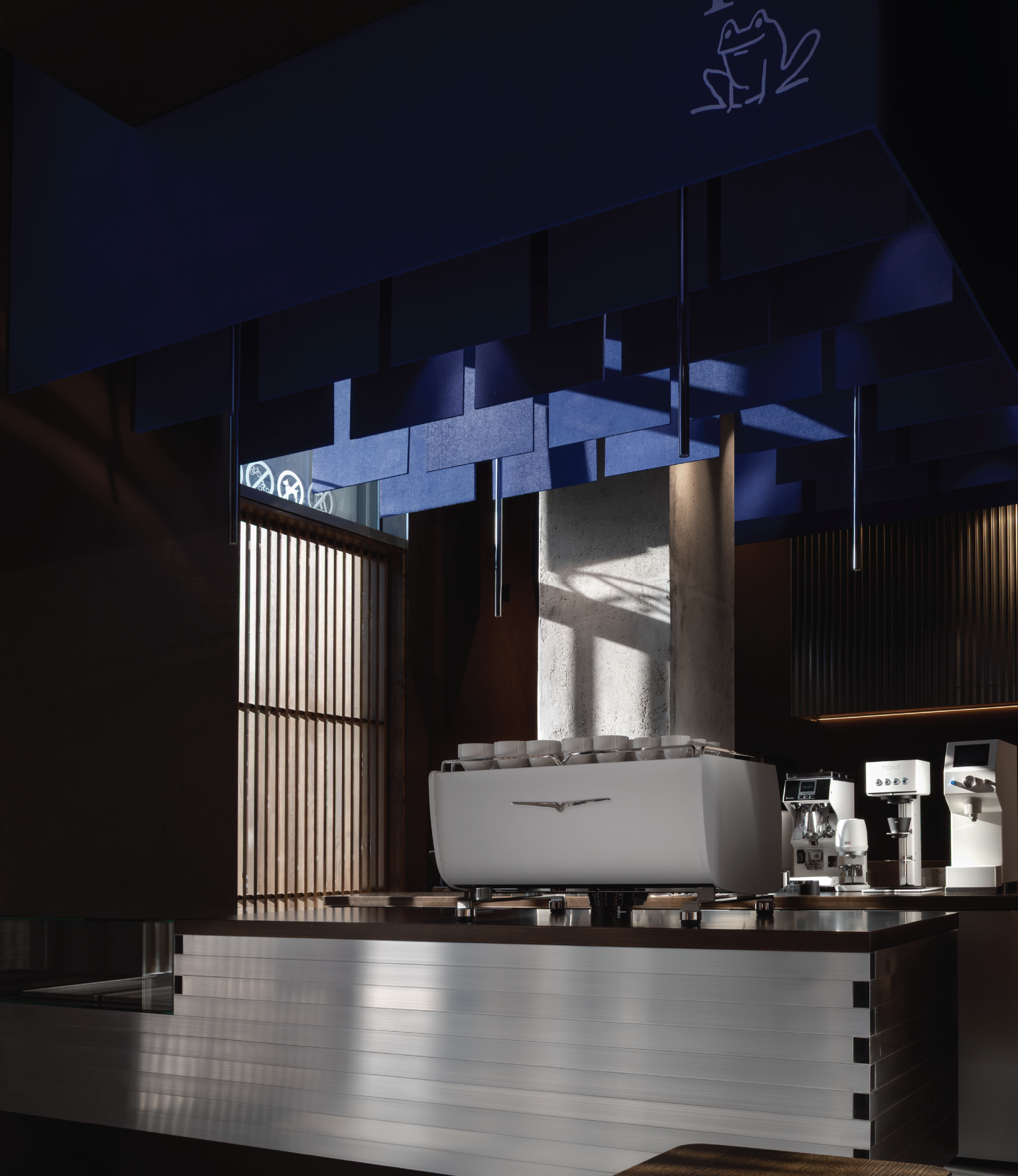 At Fū, felt was used with precision to create a subtle separation between the dynamic energy of the coffee bar and the calm of the seating area. While the bar remains active, the ceiling absorbs background noise, allowing conversations and coffee moments to unfold in comfort. It’s an acoustic solution designed to support both function and atmosphere.